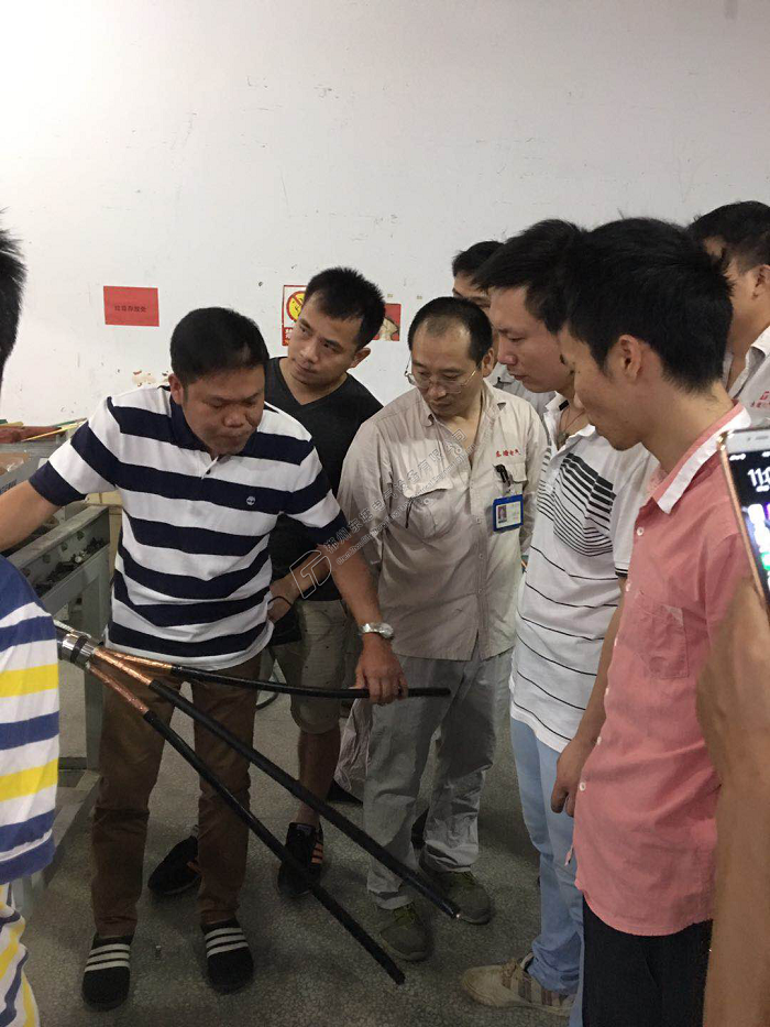 陳湘老師從理論和實踐兩個層面作了深入淺出的講解,指出了公司配電工程、產(chǎn)品設(shè)備存在的不足,并針對性地提出了許多好的建議。課中,學員們也積極互動向老師提問,并得到了老師的詳細解答。課后,陳湘老師來到公司銅排車間,現(xiàn)場手把手地指導(dǎo)有關(guān)人員制作電纜頭。